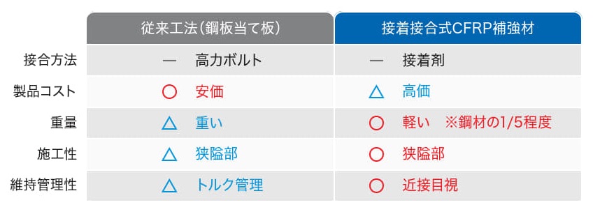 ボルト接合や溶接が不要なため、母材を傷めることなく補強が可能です。