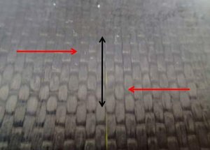 写真に示す黒矢印方向が繊維方向です。赤矢印の方向に繊維を切断する場合はご相談ください。