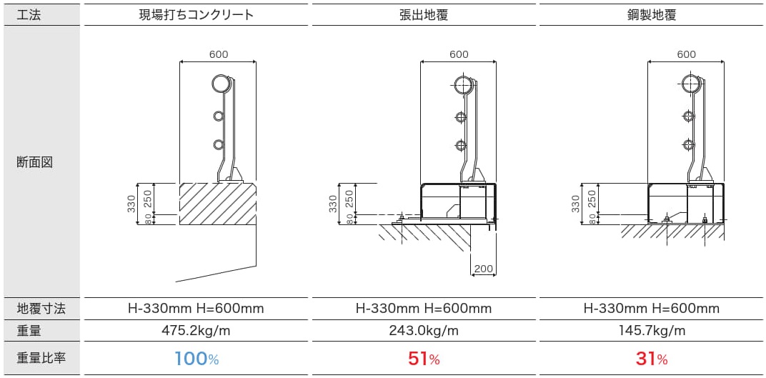 参考重量:243kg/m 同寸法のコンクリート地覆の約51%