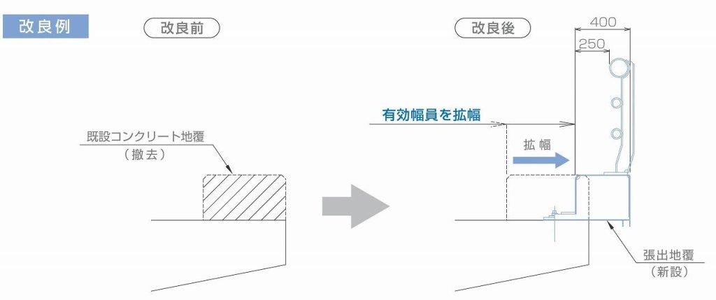 張出地覆を使用することで、有効幅員の拡幅することが可能となります。