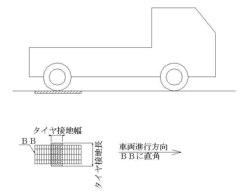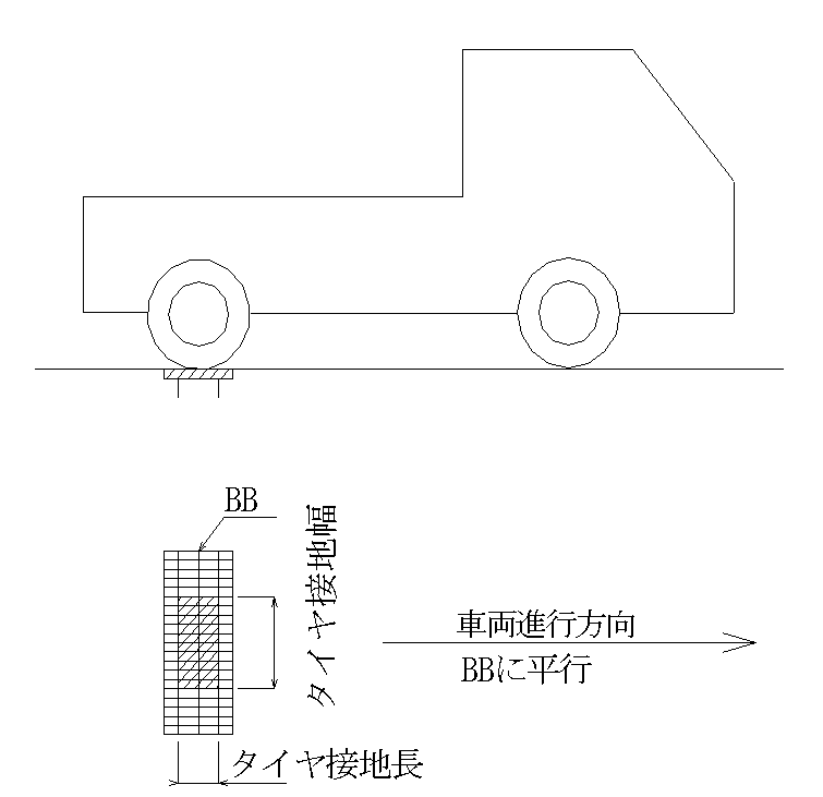 車両がベアリングバーの向きと平行に進行する場合は横断荷重にて強度を計算します。