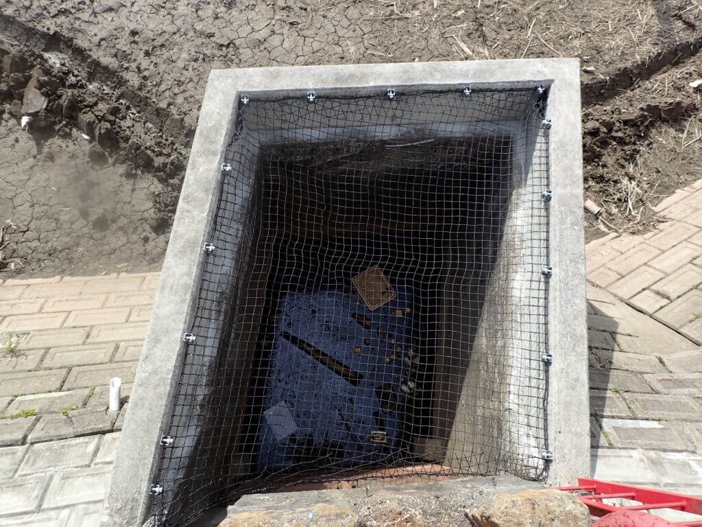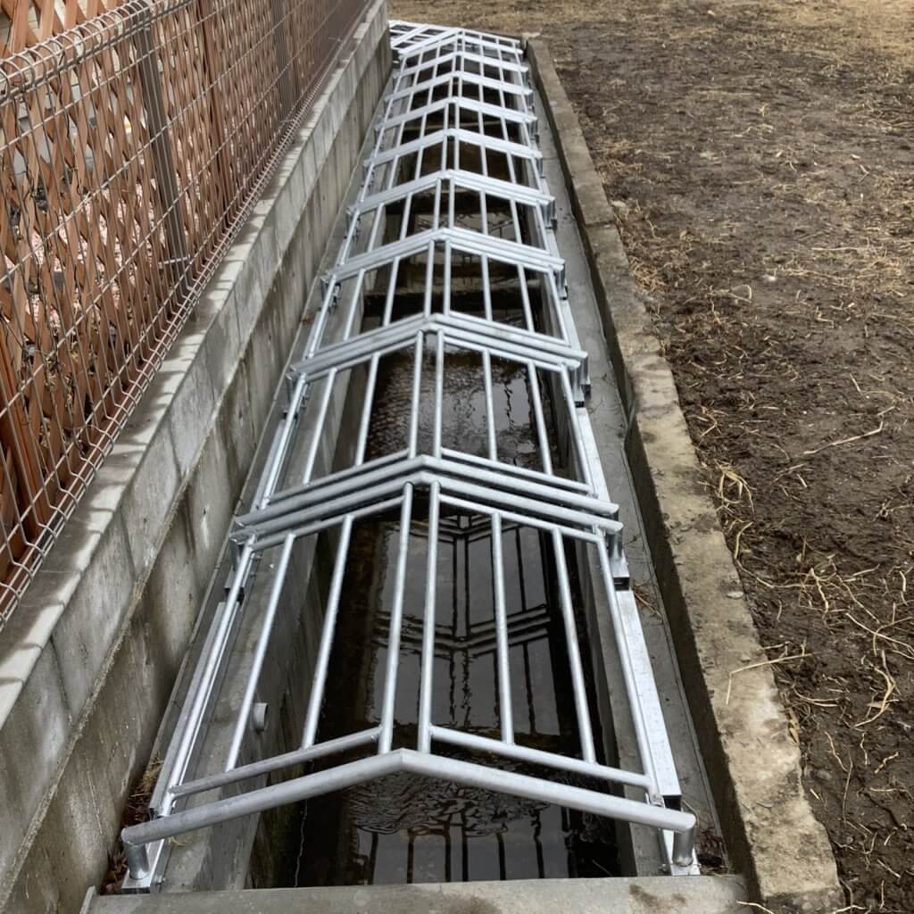 水路パイプガードは、水路を覆う構造で、パイプで構成されています。そのため、上に乗ることが可能です。また、中間部材が開閉可能なため、水路内の清掃が簡単に行えます。