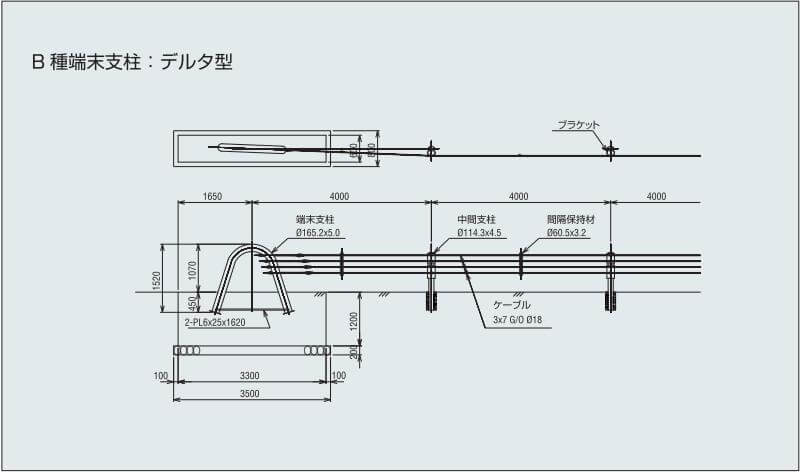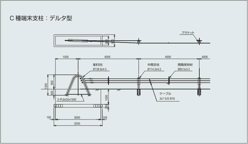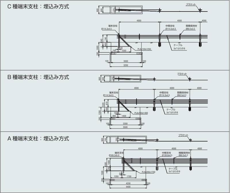 注 1) 端末支柱には上記埋込方式の他にデルタ型とアンカーボルト方式とがあります。