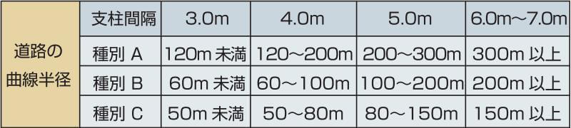 曲線部に設置する場合には、曲線半径に応じて支柱間隔を下表のように狭くします。