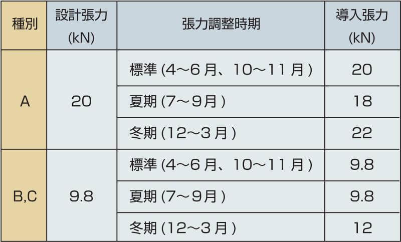 但しB種,C種の初張力9.8kNのものは、夏季(7月~9月)にも標準初張力で施工してください。