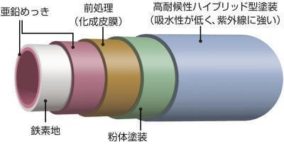 粉体塗装の上に、高耐候性ハイブリッド型塗装をする事により、吸水性が低く、紫外線に強い塗装が可能となり、海岸地域や耐雪地域の対策に適しています。