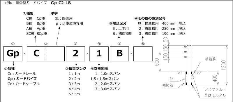 (kg/m)路側用 土中用 C Gp-C-3E 2.4×48.6×2,936 4.5×114.3×2,200 3 20.2 B Gp-B-3E 3.2×48.6×2,936 4.5×114.3×2,300 23.3 A Gp-A-3E 3.8×60.5×2,936 4.5×139.8×2,475 33.0 構造物用 C Gp-C-2B 2.4×48.6×3,936 4.5×114.3×1,200 2 18.3 Gp-C-2B-2 4.5×114.3×1,050 17.3 B Gp-B-2B 3.2×48.6×3,936 4.5×114.3×1,200 20.9 Gp-B-2B-2 4.5×114.3×1,050 19.9 A Gp-A-2B 3.8×60.5×3,936 4.5×139.8×1,225 29.2 Gp-A-2B-2 4.5×139.8×1,075 27.9 歩車道境界用 土中用 Cp Gp-Cp-2E 2.4×48.6×3,936 4.5×114.3×2,200 24.8 Bp Gp-Bp-2E 3.2×48.6×3,936 4.5×114.3×2,300 28.0 Ap Gp-Ap-2E 3.8×60.5×3,936 4.5×139.8×2,475 39.2 構造物用 Cp Gp-Cp-2B 2.4×48.6×3,936 4.5×114.3×1,200 18.3 Gp-Cp-2B-2 4.5×114.3×1,050 17.3 Bp Gp-Bp-2B 3.2×48.6×3,936 4.5×114.3×1,200 20.9 Gp-Bp-2B-2 4.5×114.3×1,050 19.9 Ap Gp-Ap-2B 3.8×60.5×3,936 4.5×139.8×1,225 29.2 Gp-Ap-2B-2 4.5×139.8×1,075 27.9