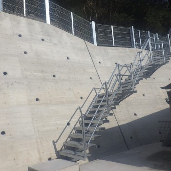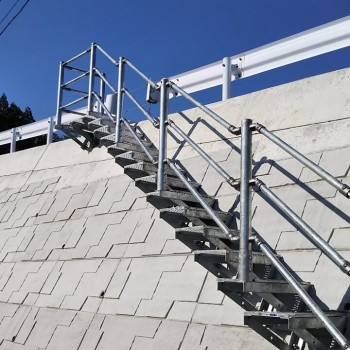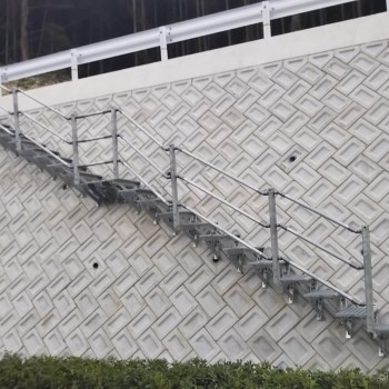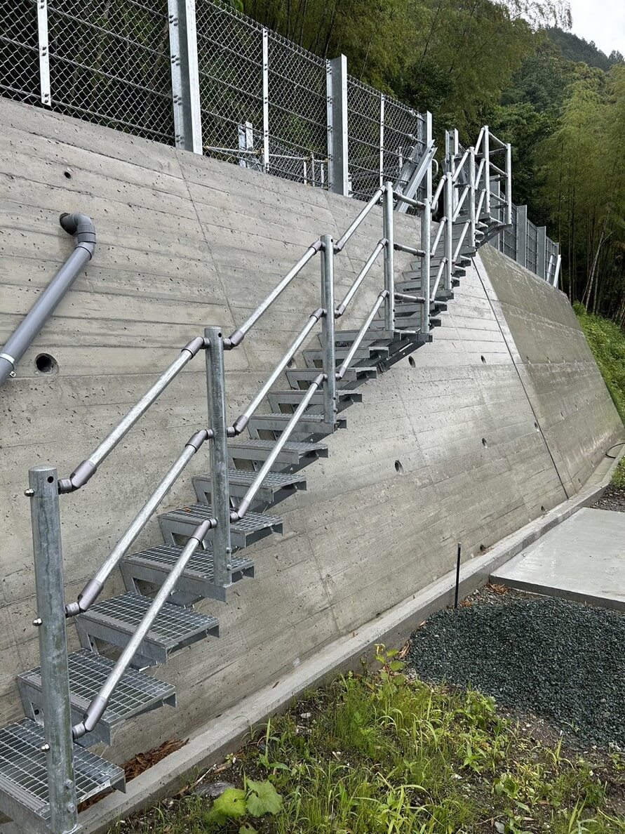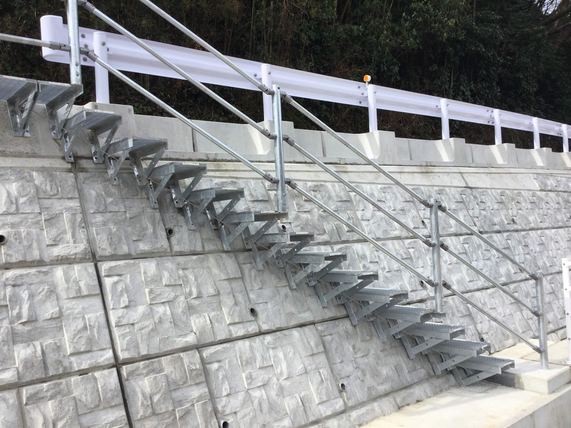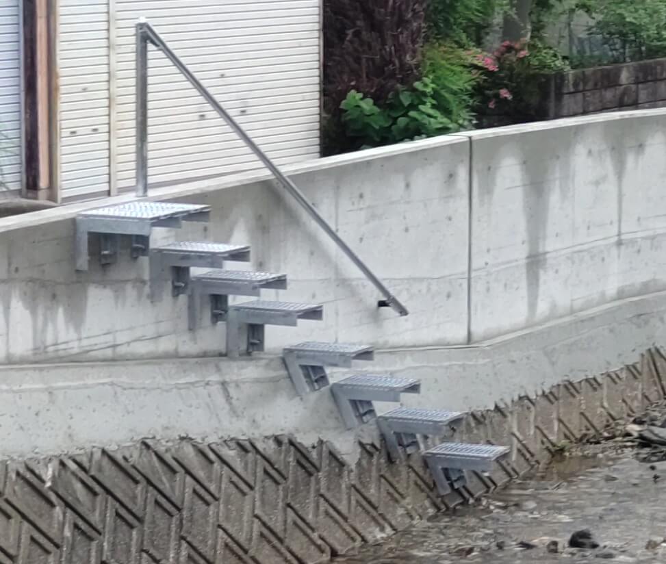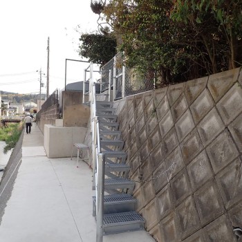 既設の擁壁に後付けできるグレーチング製の階段です。