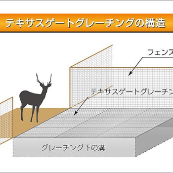 テキサスゲートグレーチングは、鹿や猪などの動物がグレーチング(格子状)の上を歩きたがらない性質を生かした 獣害対策製品です。