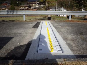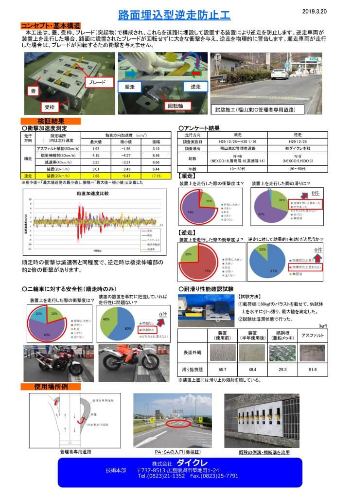 本工法は、蓋、受枠、ブレードで構成され、これらを道路に埋設して設置する装置により逆走を防止します。