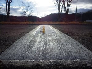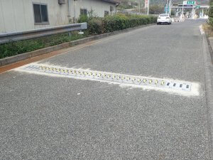 路面に設置したブレードにより逆走車両に衝撃を与え、注意喚起するもの。ブレードは、順走時には路面下に沈み込む。