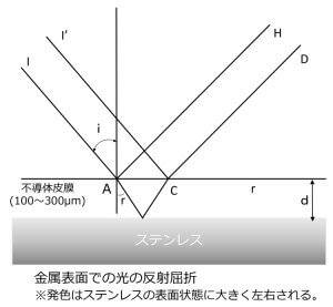 ステンレス鋼の発色は、表面に形成された酸化皮膜(不動態被膜)による光の干渉現象によって生じます。これは、反射面が異なる2つの光の経路差と波長との関係によって特定の波長が強調され、その波長に対応する色が観察されることで、ステンレスの色調として認識されるのです。